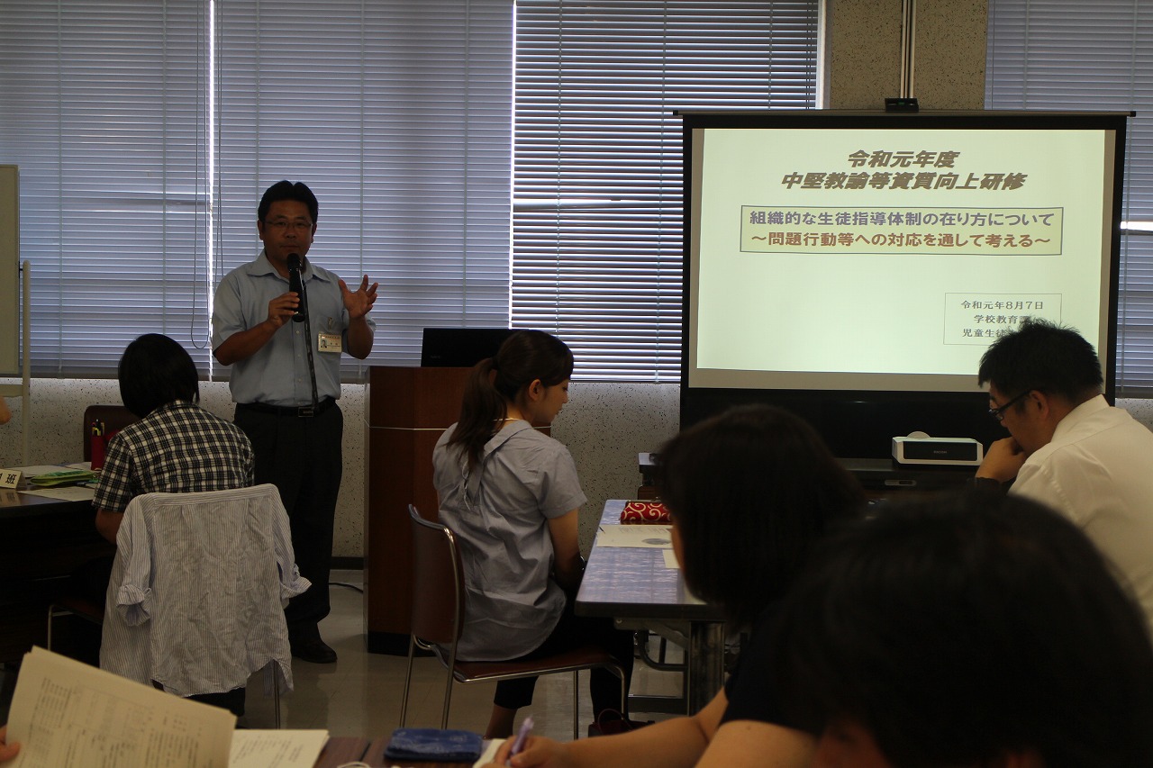 令和元年度第5回中堅教諭等資質向上研修「生徒指導/社会教育」を行いました。学校教育課(児童生徒支援室)参事補による講義・演習「組織的な生徒指導体制の在り方について」や竹遊楽クラブの方々による実習「竹籠作り」、社会教育課参事による講義「今求められる生涯教育・社会教育」を通して、組織的な生徒指導体制の在り方や学社連携を推進するための学校、家庭、地域社会等との連携協力の在り方について理解を深めました。